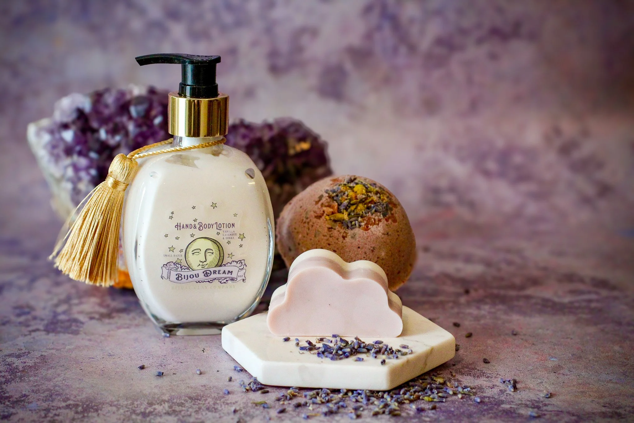 Hand and body lotion bottles were styled with natural elements like dried botanicals and raw crystals, reinforcing the idea of care and intention. Soap bars were photographed mid use, with gentle bubbles and scattered lavender buds, so they felt alive rather than pristine. Bath bombs were shown cracked open, revealing texture and color, inviting the viewer to imagine the experience rather than just the object.